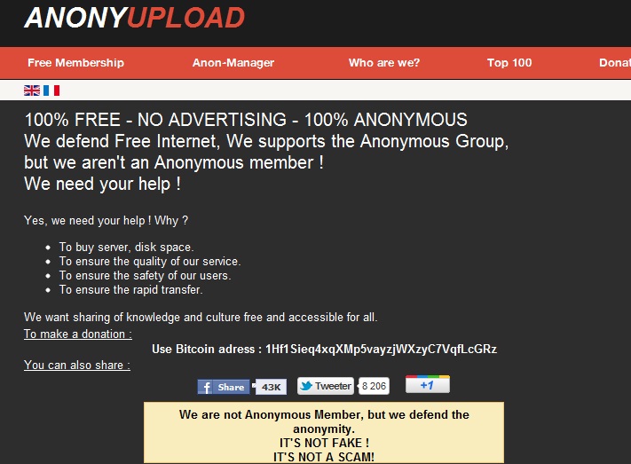 El grupo de activistas alerta sobre un sitio que utiliza su nombre. Anonyupload, promete ser una alternativa a Megaupload y pide donaciones para su funcionamiento; sin embargo, Anonymous ha declarado que no tiene relación con el portal y aclaró que podría tratarse de una estafa.