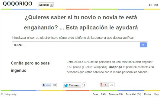 QOQORIQO, que se pronuncia ko ko ri ko, es una aplicación web pensada para parejas con problemas de confianza. Los usuarios introducen el número de celular y el correo electrónico de su novio o novia y el software buscar si hay más personas que introdujeron los mismos datos. Si bien no posee con una gran base de datos, la app te brinda la posibilidad de recibir notificaciones si los datos de tu compañero son ingresados a la red por otra persona.