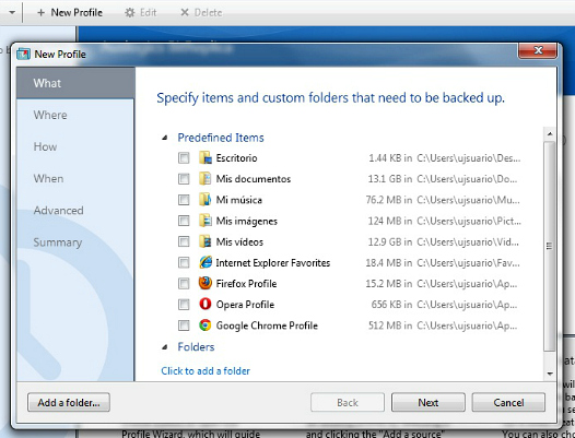 El programa permite crear distintos perfiles, en los que se puede agrupar diferente información. Puedes generar un perfil sólo para backups de cosas de trabajo, uno para tus recuerdos, otro para tu música, por ejemplo. Descarga e instala el programa, luego ábrelo. Selecciona New profile y elige qué carpeta quieres respaldar. Hecho esto, deberás decidir dónde guardar la copia y cómo; es decir, si deseas que se guarde un respaldo de forma automática cada cierta cantidad de tiempo o si prefieres hacerlo de manera manual.