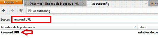 A continuación, verás una lista de cosas entre la que debemos buscar «keyword.URL» (sin las comillas). Puedes utilizar el pequeño buscador ubicado en la parte superior para encontrarlo: