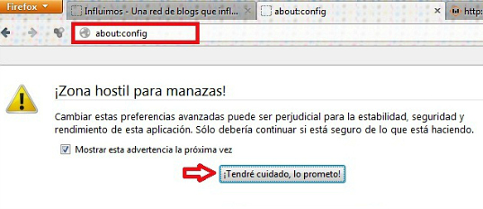 En la barra de direcciones de Firefox escribe «about:config» (sin las comillas) y presiona Enter. Aparecerá una advertencia sobre la importancia de las configuraciones avanzadas que sólo debes aceptar: