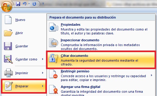 En Word, desde la versión de Office 2007, contamos con la posibilidad de encriptar un documento. Abre el archivo, haz clic en el botón de Office, selecciona Preparar y luego Cifrar documento. A través de ella podremos utilizar una contraseña creada por nosotros para acceder al archivo: