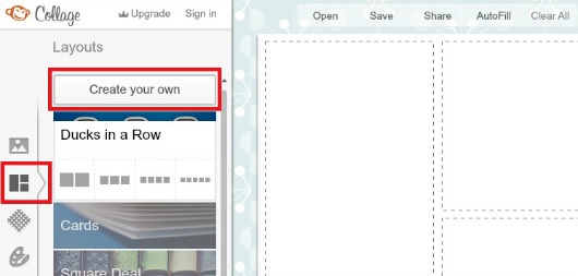 Verás una nueva ventana. El segundo botón del menú lateral te permitirá seleccionar la ubicación de las imágenes o bien, crear uno por tí mismo. Para elegir alguno, sólo haz clic sobre las opciones del menú o sobre el botón Create your own, para crear tu propio diseño: