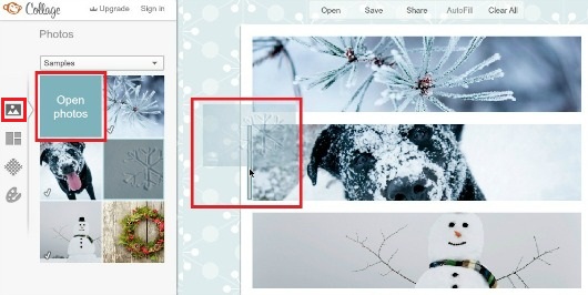 El segundo paso consta en subir las fotos. Haz clic en el primer botón del menú lateral y luego, en el botón celeste Open photos, podrás seleccionarlas desde tu computadora. Las imágenes aparecerán en el lateral y deberás arrastrarlas hacia el lugar que deseas que ocupen en el collage.