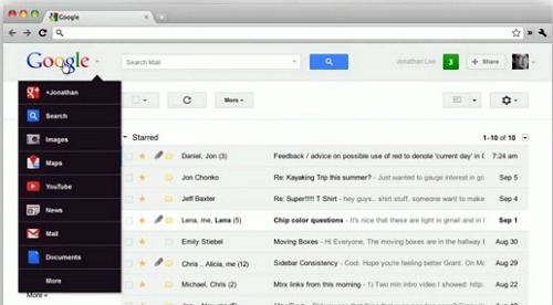 Como puedes ver en la imagen, el nuevo diseño consta de una barra gris superior que unifica el logo de Google, el campo de búsqueda y las notificaciones de Google+. Al hacer clic sobre el logo, se deslpliega un menú con todos los servicios de la empresa: Imágenes, Noticias, Gmail, Youtube, Calendario, Web, etc.