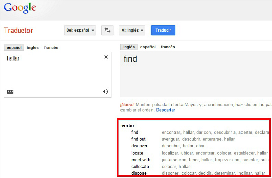 En el ejemplo que ves en la imagen, ingresamos la palabra Hallar y Google la traduce como Find; debajo, vemos otras posibles opciones en inglés, que le dan a la palabra otros significados, como descubrir, encontrar o averiguar. Se trata de una nueva característica que puede ser muy útil, sobre todo, si conoces algo del idioma al que deseas traducir.