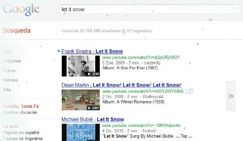Aunque el calor agobia nuestras latitudes, el hemisferio norte se prepara para festejar una Navidad cargada de nieve. Anticipándose a ello, Google decidió agregar algunos fríos copos a la web de su buscador y darle a tus búsquedas un ambiente festivo. Para verlos sólo debes escribir Let it Snow en el campo de búsquedas del sitio.