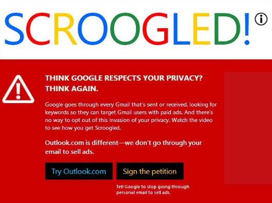 Microsoft pide a la gente que firme una petición para que Google deje de escanear los contenidos de los correos. La campaña se denomina Scroogled, tiene una sitio web propio y comenzó en diciembre de 2012; en ese momento, se denunció que el buscador daba prioridad en sus resultados a empresas que pagaban por aparecer primero, engañando a los usuarios y perjudicando a miles de comercios. Sin embargo, un organismo administrativo norteamericano dictaminó que las prácticas de Google no frenaban la competencia.